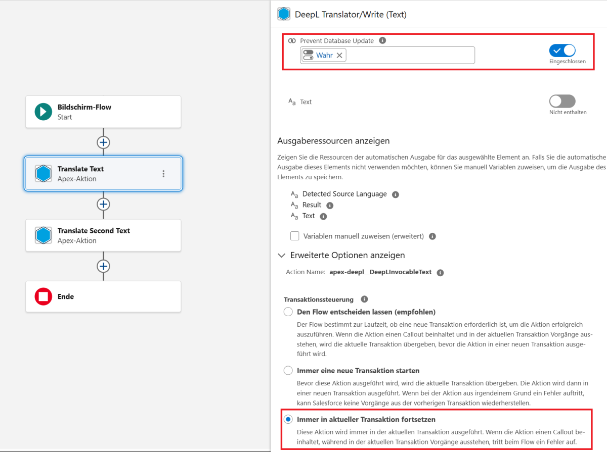 Für Transaktionen vom Typ "Text" können bei mehreren aufeinanderfolgenden Transaktionen (in Apex/Salesforce Flows) Fehler bei der Speicherung von Daten oder Datenbankabfragen auftreten. Um diesen Fehlern vorzubeugen, gibt es die Option "Prevent Database Update", welche Datenbank-Operationen für die jeweilige Aktion zwischenspeichert, jedoch noch nicht ausführt. Alle gesammelten Datenbank-Operationen werden dann bei folgenden Aktionen vom Typ "Text" einmalig ausgeführt.